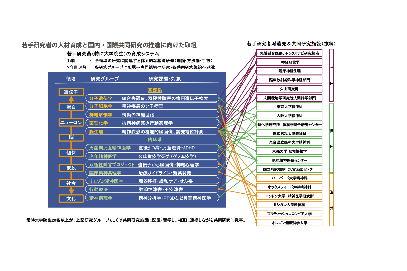 研究に関して、九大精神科には実に多くの研究グループ、臨床グループが存在し日々精力的な活動を行っています。私たちは希望する先生の大学院進学を積極的に支援します。小児精神医学、老年精神医学(久山町研究)、認知行動療法、精神病理学、神経生理学、神経化学、精神薬理学、分子精神医学、リエゾン精神医学といったさまざまな研究室がありますので、ぜひホームページ内の紹介文を詳しくご覧になってください。臨床大学院では専門外来での診療に従事しながら、臨床研究を論文にまとめあげることができますし、精神疾患の病態基盤を調べる基礎大学院への進学も歓迎します。さらに研究を追求したい場合には、国内外の専門機関に留学することも推奨しており、紹介することが可能です。