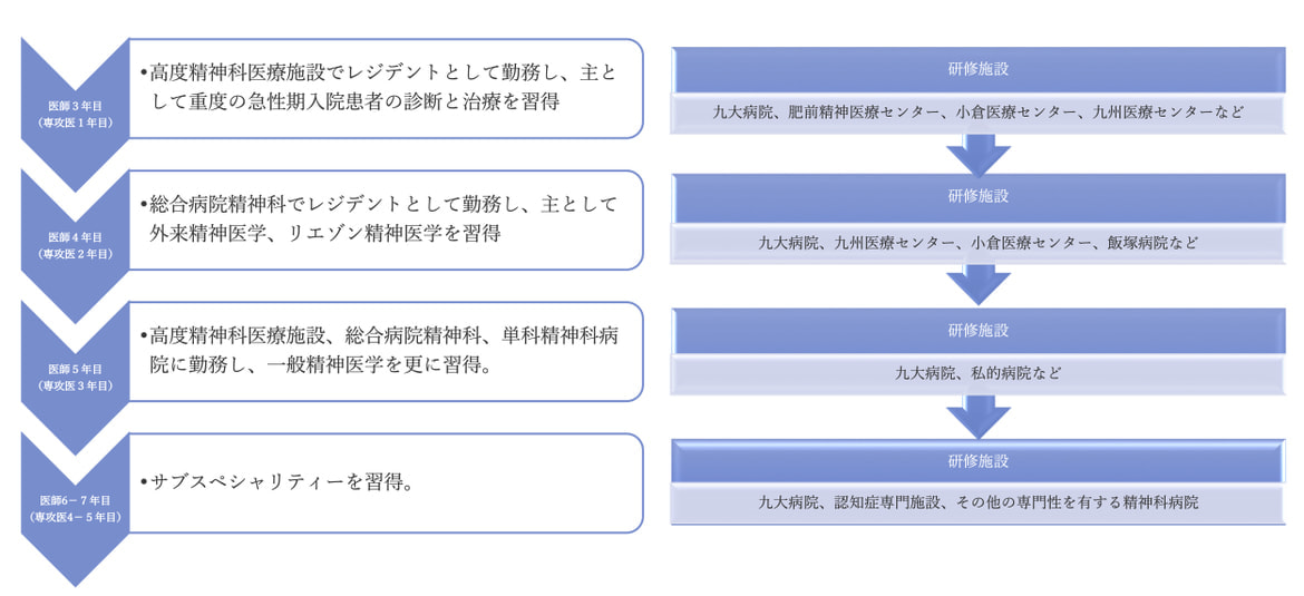 九大精神科における後期研修プログラムでは、精神科診療・診断学、薬物療法学、各種精神療法(行動療法・力動精神療法)、生物学的精神医学、精神病理学、児童精神医学、老年精神医学、てんかん、リエゾン精神医学、社会精神医学、司法精神医学など、精神医学の幅広くかつ高度の専門性を習得することを目標としている。教室には、これらの専門性を有する指導教員・研究室が揃っている。また各種専門性を有する教育関連施設と緊密な連携体制を有しており、専攻医は教室ならびに教育関連施設において、高度の専門性を習得することができる。
